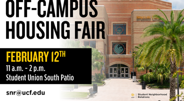 UCF Student Neighborhood Relations will be hosting a Housing Fair this spring to assist you in your search for off-campus living options near campus. Meet with local properties to learn more about processes involved in securing off-campus housing. Talk to offices such as Financial Aid, UCF PD, and more so that you can start looking ahead to finding your next home!